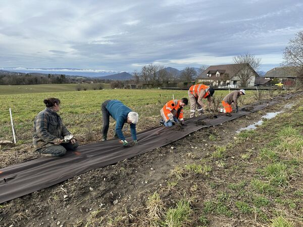 Le deuxième chantier s’est déroulé chez une maraîchère bio à La Balme-de-Sillingy, où 200 mètres linéaires de haies ont été plantés. L’objectif : protéger les cultures du vent tout en favorisant la biodiversité et la présence d’auxiliaires de culture.
